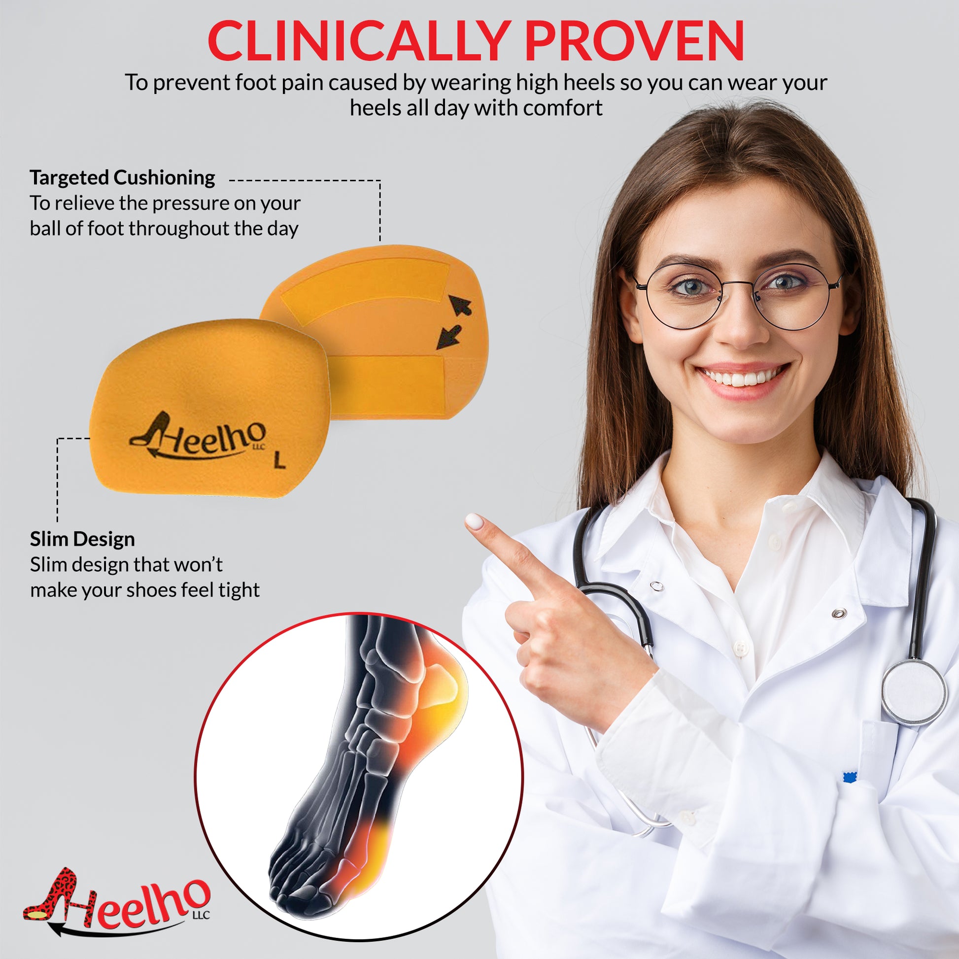 - NO MORE HIGH HEEL PAIN - Designed by top-notch podiatrists & wound care specialists, Heelho ball of foot pads have an "indention" that redistributes the pressure to a greater surface area to ensure a pain-free lifestyle anytime you kick up your heels
