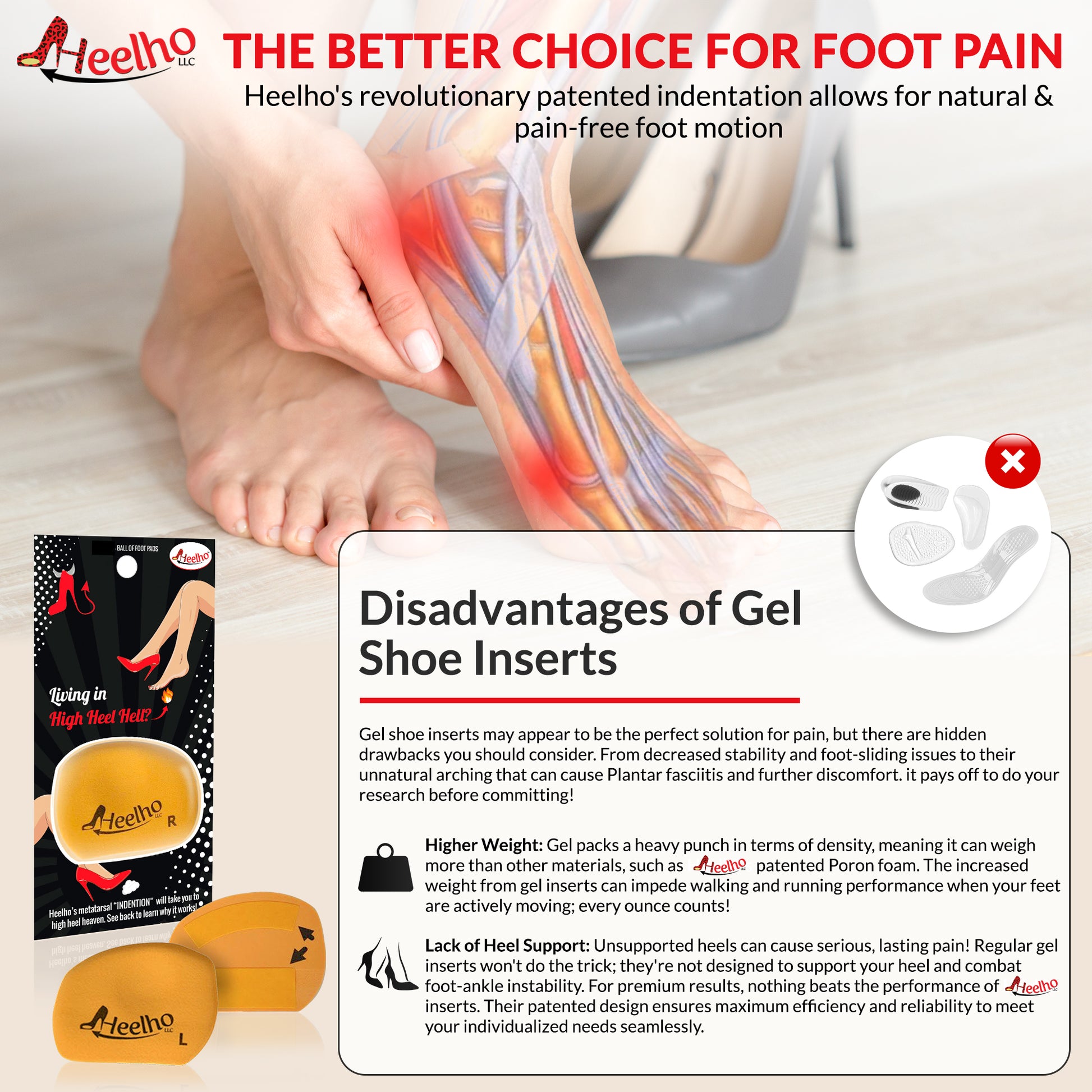 - GET OUT OF HIGH HEEL HELL - Heelho ball of foot cushion for high heels have patented indention & metatarsal support which makes them a better choice than the sweaty soft gel inserts. Our shoe heel inserts keep feet cool, dry & prevent odors
